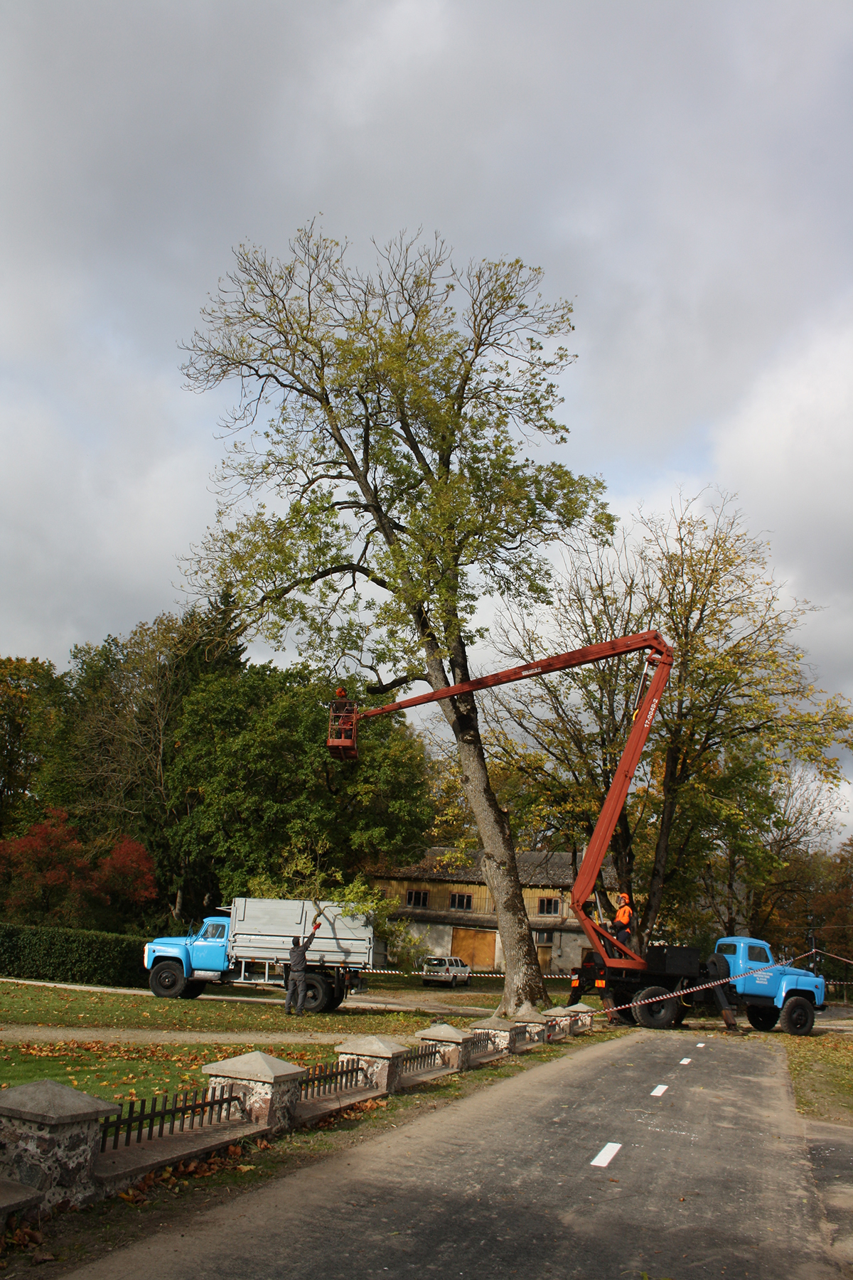 Eile lõikusid ettevõtte Technical Work OÜ töötajad Vaimastvere kooli pargi sissesõidutee ääres kasvanud ohtliku saarepuu tükkideks, kusjuures idee puu maha…