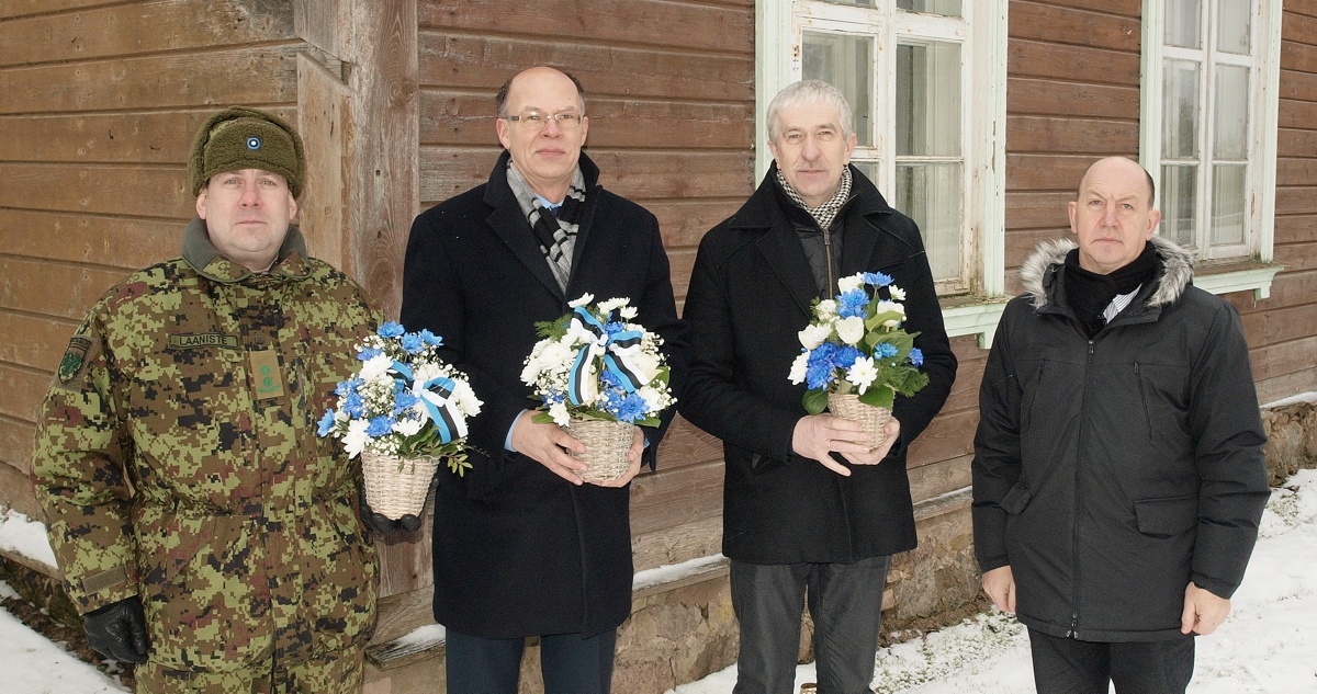 Neljapäeval 2. veebruaril asetasid seoses Tartu rahu 97. aastapäevaga lilled Laiusevälja külla Jaan Poska sünnikodu juurde (vasakult) Kaitseliidu Jõgeva maleva…