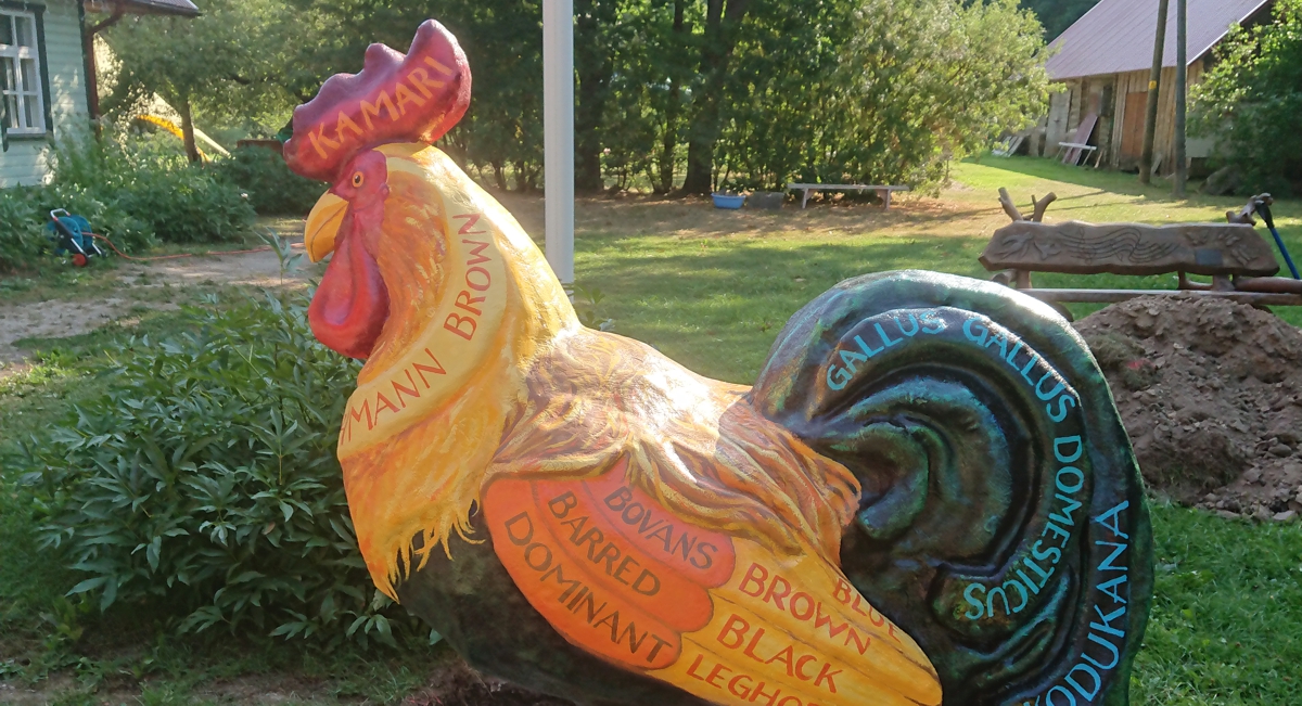 Õnneliku Kuke kuju autor on kunstnik Anni Irs, kelle tööde näitus on avatud Kamari Seltsimajas.
