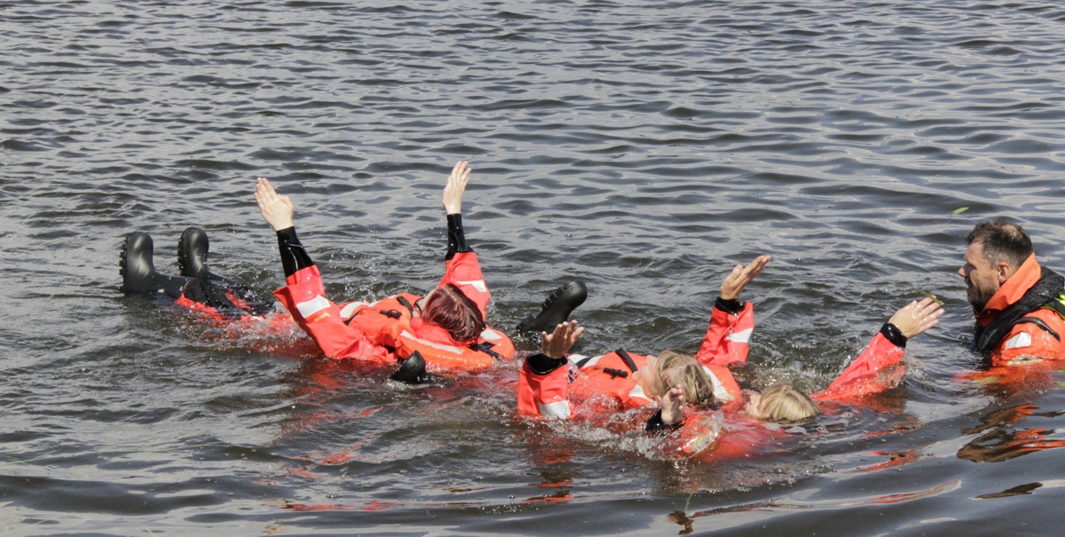 Lõpuks istume paati ning sõidame Peipsi järvele, kus meid ootab viimane harjutus. See pole kergemate killast ning nõuab omajagu julgust. Nimelt palub kapten aluse hüljata. Lihtsamas keeles tähendab see seda, et paadist tuleb viivitamatult lahkuda. Ka selleks on eraldi nipp. Esiteks tuleb kinni hoida päästevestist, et vette kukkudes vest kindlalt püsiks ja rõhk seda lõhki ei lööks. Ka ninast võiks kinni hoida, kuid see on oma mugavuse nimel. Ning siis tuleb vette… astuda. Minu kõhklused, mis vägi sunniks mind küll vabatahtlikult keset Peipsi järve paadist vette minema, lükati ruttu ümber. Nii tuli värisevate jalgadega paadi äärele ronida ning astuda. Sellisel hetkel käib peast läbi kümneid mõtteid ning lisaks küsimusele, miks ma seda teen, valdab mind aukartus korraga nii vee kui ka päästjate ees. Siis ma astun. Järgmisel hetkel tõmbab päästevest mu taas pinnale ning on veidi kergem tunne. Järgmine väljakutse on paati saada. See on vajalik siis, kui on juhtunud õnnetus ja päästepaat appi tuleb. Enese vinnamine olukorras, kus liikumist takistavad ja kaalu lisavad ülikond ja päästevest, on omaette ooper. Lõpuks see õnnestub, kuid omajagu aitab Kaupo siiski kaasa.