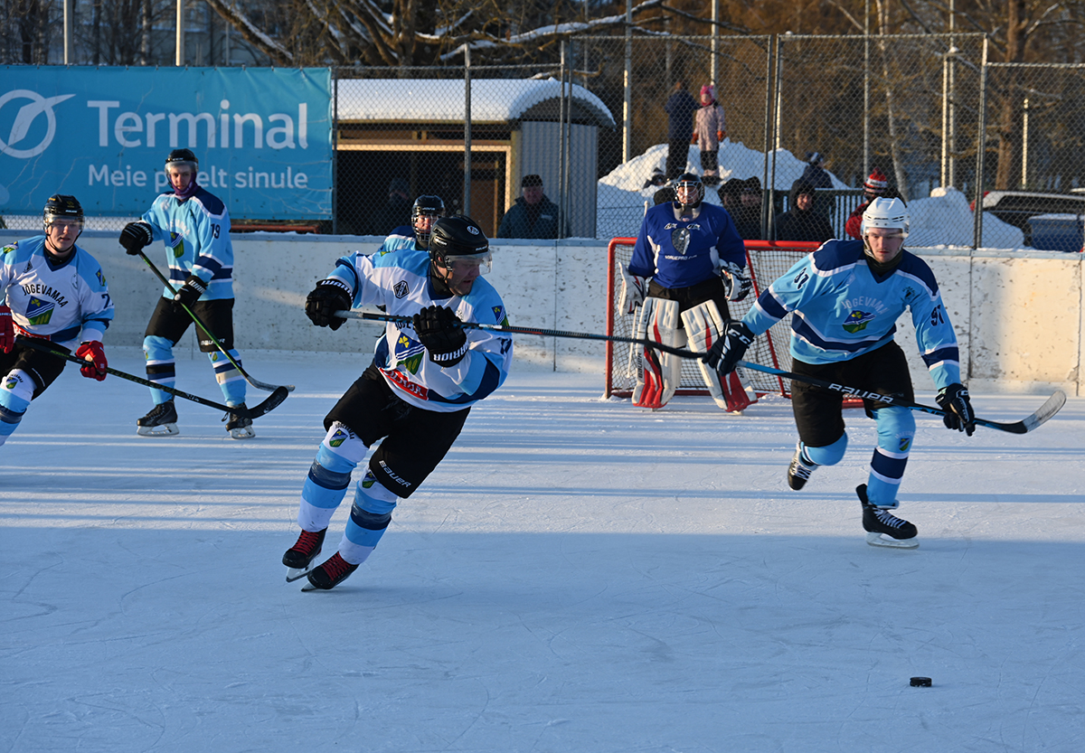 Päeva viimases mängus olid jääl tänased tegevmängijad. FOTOD: TIIT LÄÄNE Laupäeval tähistati ehedas talveilmas Jõgeva jäähoki 80. aasta juubelit. Neljas juubelimängus osales arvukalt mängijaid ja jätkus pealtvaatajaid. Ei kohanud küll neid, kes jätkavad 1968. aastal alguse saanud „jääväljaku rajamise ettevalmistusi tasuvusanalüüsi alusel.“ TIIT LÄÄNE Ilm oli talvine (-14o C), kui keskpäeval tulid jääle veteranide meeskonnad….