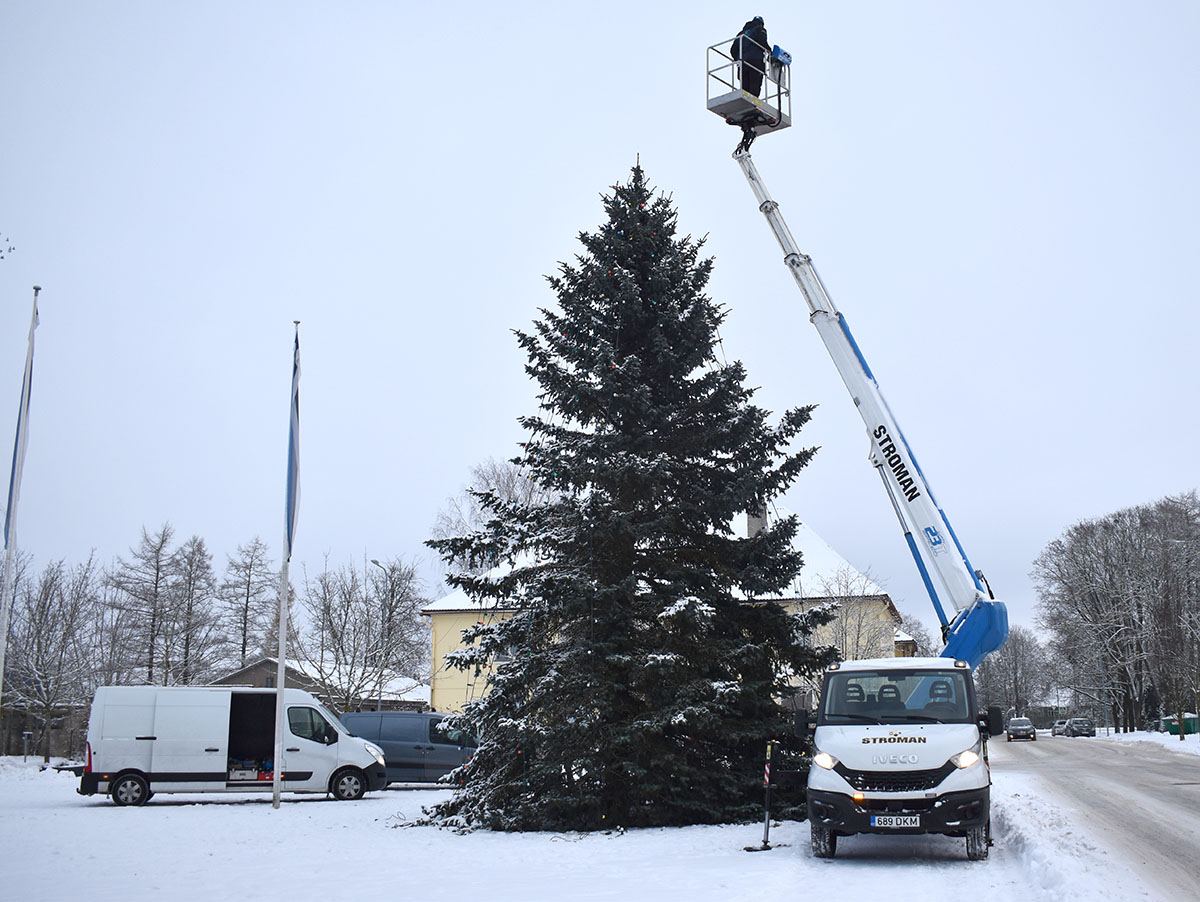 Esmaspäeval sättisid töömehed kuusele tulesid. FOTO: VAMBOLA PAAVO Jõulutuled süttivad Jõgeva jõulukuusel esimese advendi õhtupoolikul. Tänavune Jõgeva jõulupuu sai töömeeste poolt paika tõstetud reedel. Sel aastal polnud vaja puud kaugelt otsida. Pea nelikümmend aastat Jõgevale avalikke jõulupuid toonud Maido Mägi kinnitusel pärineb tänavune kuusk siitsamast Jõgeva linnast. „Puu loovutas Rohu 2 korteriühistu. Uuel aastal on…