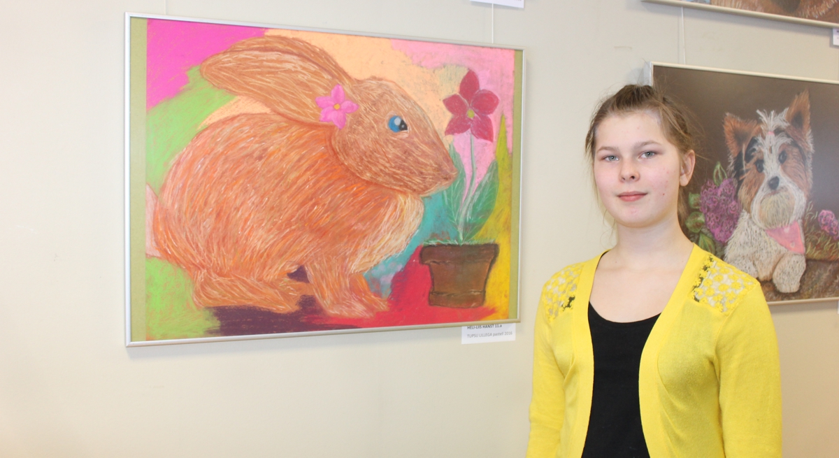Koera, jänese ja kiisu on näitusele toonud 11-aastane Heli-Liis. Tüdruku kass kannab nime “Eriline”. Seda kass ongi, sest tal on üks silm kollane ja teine roheline. “Alguses tegin ma talle kollased silmad, aga see värv ei meeldinud mulle. Tegin siis ühe silma sinisega üle ja see muutus roheliseks. Mulle ja teistele õpilastele hakkas see kohe meeldima,” rääkis Heli-Liis, kuidas tema joonistatud kass erilise välimuse sai. Tüdruku suured lemmikud on aga jänesed, neid on tal lemmikuna mitmeid olnud. “See jänes on ühe foto järgi tehtud. Tal oli seal lill kõrva taga ja kohe oli selge, et seda ma tahangi joonistada. Nimetan seda jänkut hellitavalt tupsuks,” rääkis autor. Jänes on Heli-Liisi sõnul tema kõige värskem töö, just enne esitlust sai valmis. Viimase viimistluse andis ta värviküllase taustaga. “Mulle meeldivad värvid ja tahan neid alati palju lisada. Taustu pildi järgi teha ei saa. Panen tavaliselt silmad kinni ja joonistan seda, mida siis näen,” kirjeldas Heli-Liis oma loomingulist puhangut. Tüdruku vahva kutsikas on pildil parasjagu õues lustimas, puuleht suus ning liblikad taustal lendlemas. Pilt väljendab tüdruku igatsust oma koera järele. “Kord tuli isa koju ja ütles, et ostis Bella. Tormasin kohe välja, aga see oli hoopis paat. Olin nii pettunud, sest arvasin, et see on koer,” rääkis tüdruk.