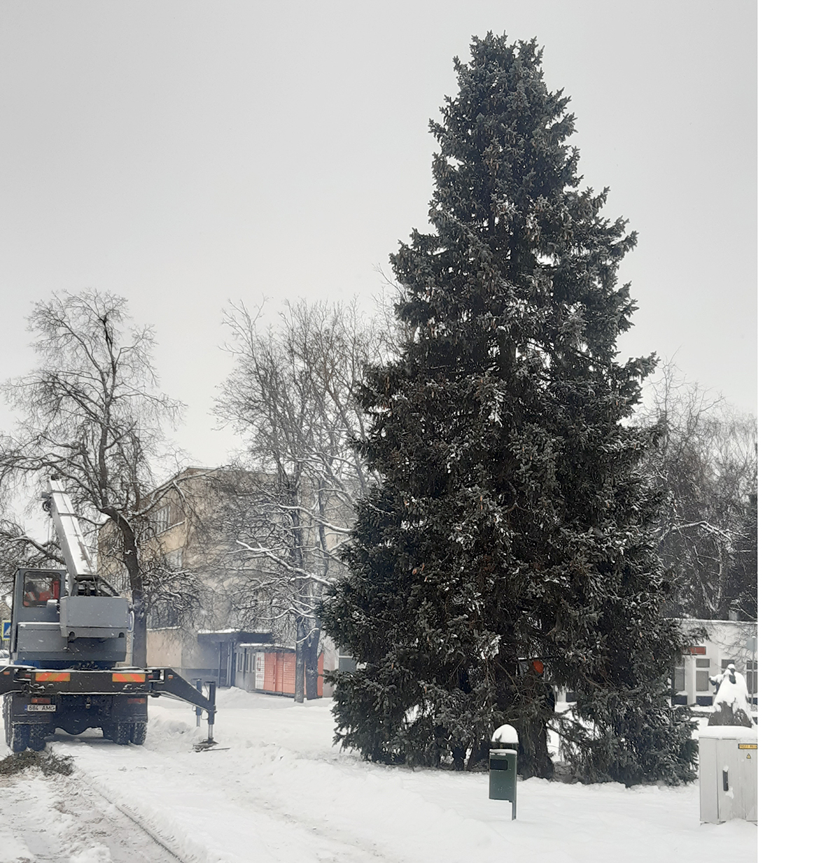 Eile keskväljakule üles seatud tänavune jõulukuusk toodi Jõgeva linnast Niine tänava krundilt. Jõulupuu kõrgus on 12 meetrit.