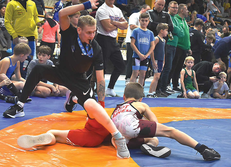 Mattidel olid kuni 15-aastased poisid ja tüdrukud 35st Kreeka-Rooma maadlusega tegelevast klubist, vilistab kohtunik Mattias Säärits. FOTO: TAAVI KELDER Jõgeva spordikeskus Virtus täitus laupäeva ennelõunal üle Eesti kohale saabunud kuni 15-aastaste noorte maadlejatega, lisaks olid kohale sõitnud ka Läti ja Leedu sportlased. Toimusid Jõgeva Ramm ja maakonnaleht Vooremaa 45. auhinnavõistlustel maadluses. TAAVI KELDER Vooremaa auhinnavõistlustel…