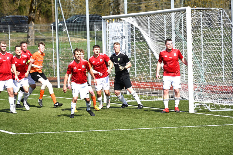 Jõgeva meeskond (punastes särkides) tegemas kaitsetööd FC Kose nurgalöögi eel. Vasakult alates on Jõgeva mängijatest pildile jäänud Marcus Mardimäe, Jürgen…...