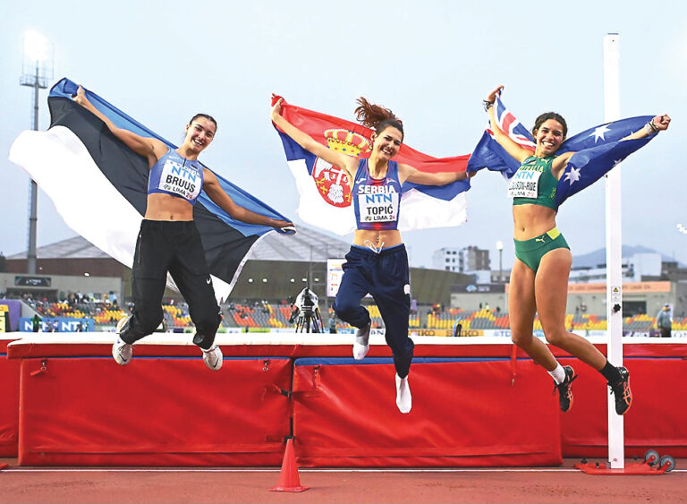 U20 vanuseklassi maailma parimad kõrgushüppajad. Vasakult Karmen Bruus, maailmameister Angelina Topic ja hõbeda võitnud Izobelle Louison-Roe. FOTO: WORLD ATHLETIC Kaks…...