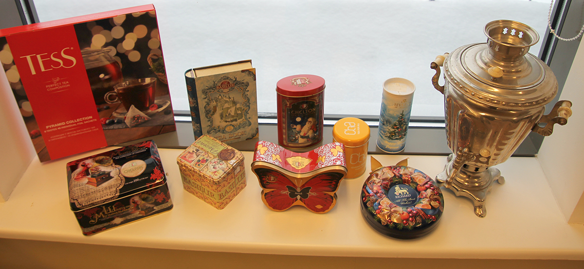 „Üks teekarp on näiteks raamatu-, teine liblikakujuline. Arvestades näituse avamisaega palusime tuua talve- ja jõuluteemalisi teepakke. Peipsiäärse teejoomistraditsioonidest on näitusel Lohusuus  valmistatava Ivan-Tšai karp. Näitusel on ka mõned teekannud ja metallist ümbrisega teeklaas. Esemed pärinevad kolme inimese kogust.”