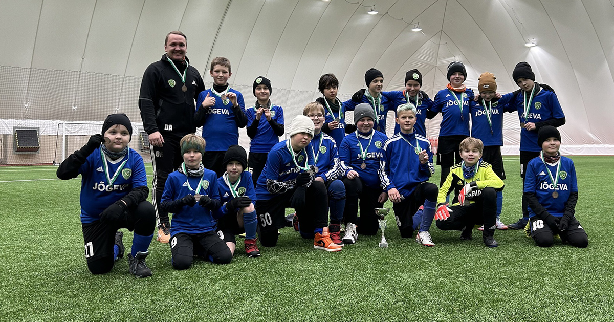 Jõgeva SK Noorus-96 pronksine U12 meeskond koos treener Daniel Aganitšiga Viljandi turniiri lõpetamisel. FOTO: ERAKOGU Pühapäeval Viljandi jalgpallihallis toimunud U12 noorteturniiril mängis edukalt Jõgeva SK Noorus-96 poistevõistkond, kes saavutas kolmanda koha. IMRE ERIMAA Turniiril osales 12 meeskonda, kes alustasid mängudega neljas kolmeses alagrupis. Iga grupi kaks paremat pääsesid veerandfinaali. Noorus oli ühes alagrupis Viljandi JK…