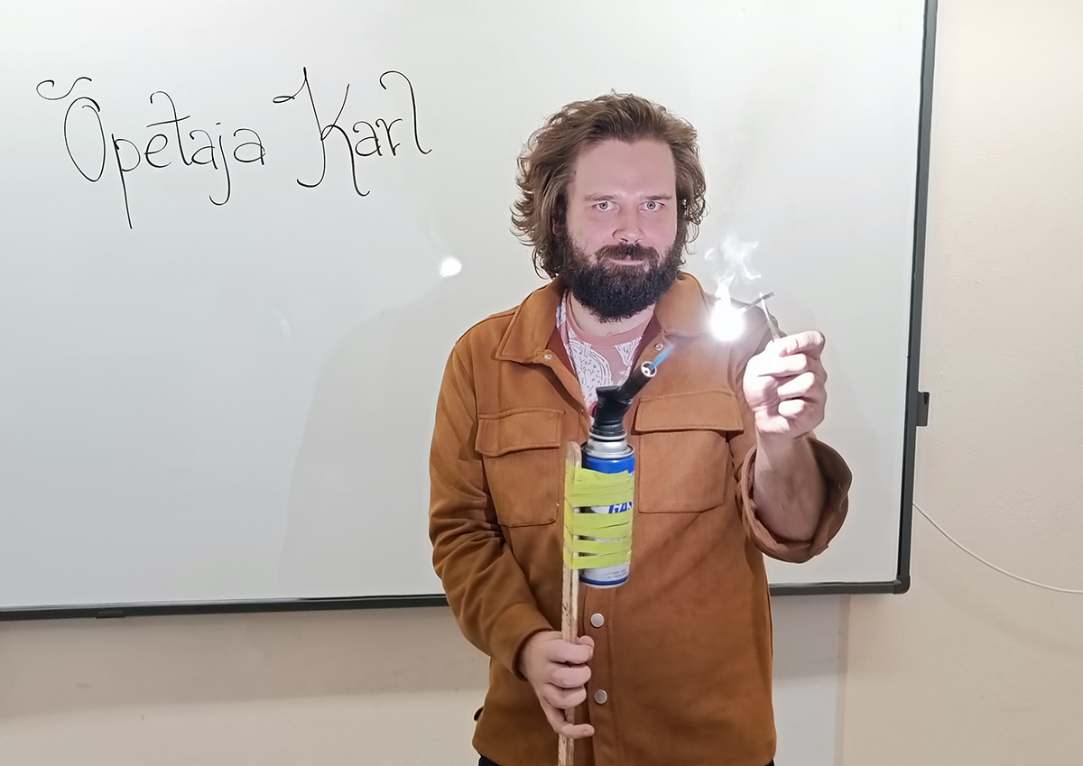 Õpetaja Karl Erik Kalmus ühendab tundides teadmised, huumori ja põnevad katsed. FOTO: TIINA SÄÄLIK Karl Erik Kalmus on tänaseks pisut üle kuu aja Puurmani mõisakoolis olnud füüsika, keemia, bioloogia ja loodusõpetuse õpetaja. Puurmaniga ta varem pole seotud olnud, siia tõi karjääripööre – Noored Kooli programmis osalemine. TIINA SÄÄLIK Puurmani mõisat ehk tulevast töökohta nägi tulevane…