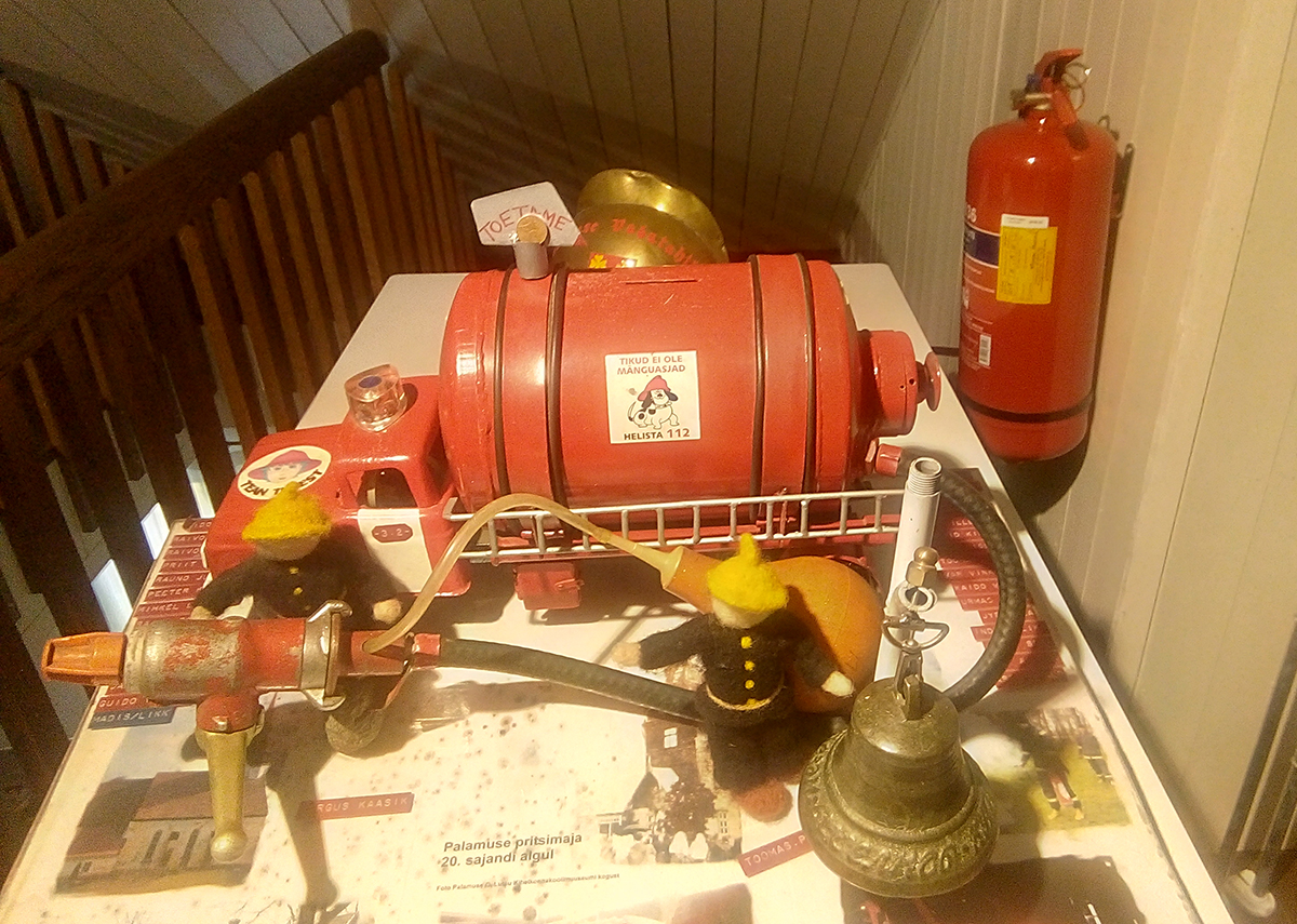 Ühelt fotolt näeb, et tuletõrjeseltsi on kuulunud Oskar Lutsu loomingust tuntud õpetaja Lauri ja kellamees Lible prototüübid Ludvig Roose ja Kristian Lill. Slaidiprogramm võimaldab näitusel tutvuda nii Eesti kui ka Palamuse tuletõrje ajalooga. 1862 loodi vabatahtlik tuletõrjeselts Tallinnas ja 1864 Tartus, 1910 avati Palamusel tuletõrje seltsimaja (hävis Teises maailmasõjas 1941). 1929. aastal oli Palamuse ühingul kaheksa käsipritsi ja veoauto Ford, mis kohandati ümber vastavalt tuletõrje nõuetele. Auto mahutas 600 liitrit vett, käsipritsi, voolikud, redelid ja 12 meest.