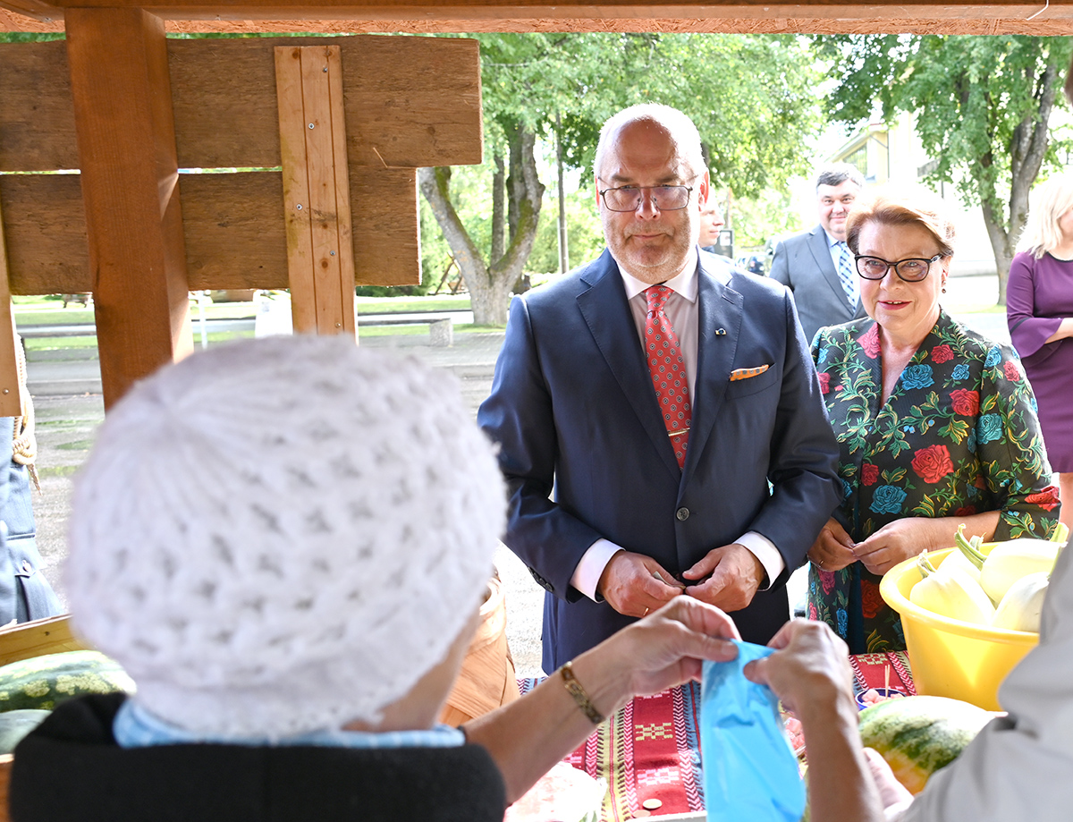 Eesti Vabariigi president Alar Karis ja proua Sirje Karis said Mustvee turult osta kohalikku arbuusi. FOTO: TIIT LÄÄNE Pühapäeval Mustvees viibinud vabariigi president Alar Karis autasustas „Eesti kaunis kodu 2022“ konkursi laureaate ja tutvus linna elu-oluga. Kultuurikeskusest väljudes suundusid Alar ja Sirje Karis linna turuplatsile. TIIT LÄÄNE Oma tervituskõnes Mustvee kultuurikeskuses kiitis president Eesti kodude…