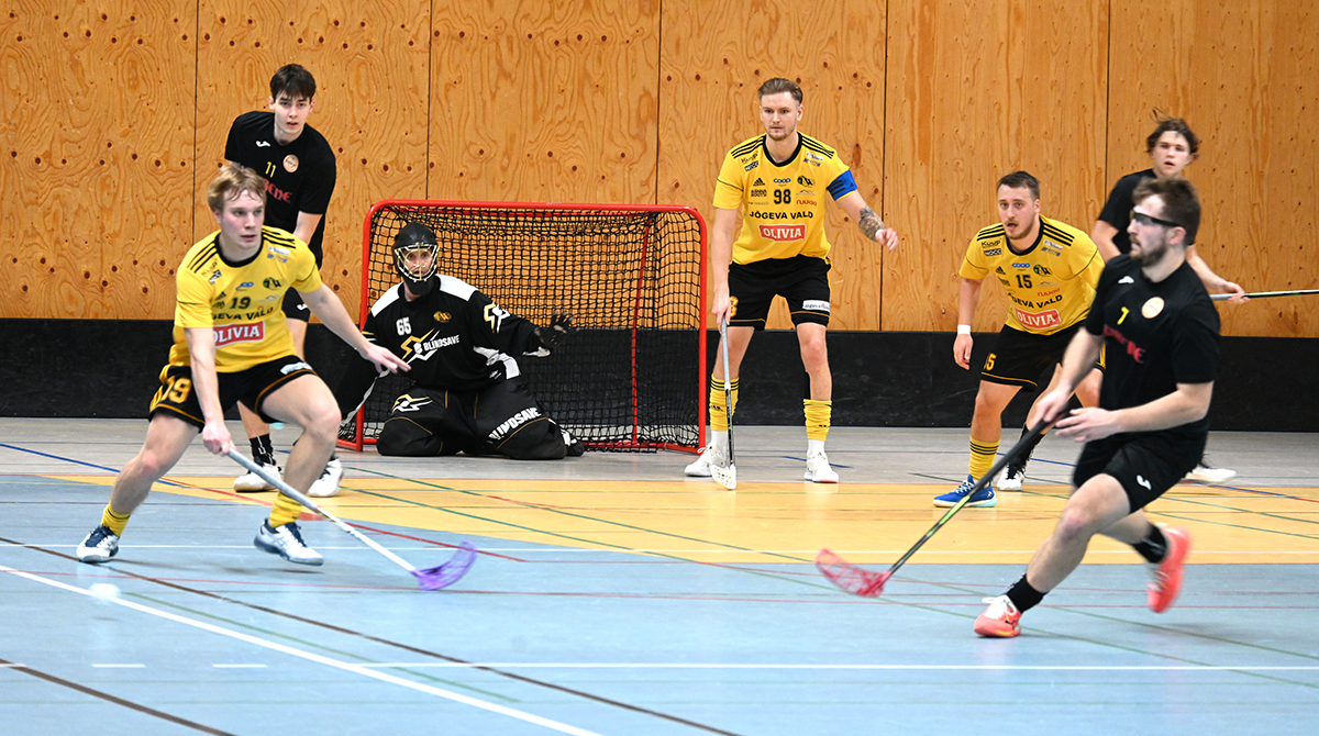 SK Tähe/Olivia meeskond mängis Läti esiliiga põhiturniiri viimase mängu Virtuse spordihoones. Jõgeva mängijatest on oma värava ees kaitsetööd tehes pildile jäänud Rasmus Randoja, Mathias Einamann ja Lauri-Robert Indus. FOTO: TIIT LÄÄNE Jõgeva SK Tähe/Olivia saalihokimeeskond lõpetas Läti meistrivõistluste esiliiga põhiturniiri kaotusega, jäädes teisipäeva õhtul Virtus spordihoones 4:6 (2:0, 1:1, 1:5) alla Rubene-1 meeskonnale. TIIT LÄÄNE…