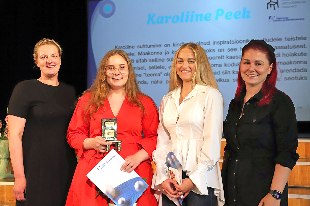 Kategooria ettevõtlik kogukonna noor väljakuulutamine. Vasakult LEEN projekti Jõgevamaa projektijuht ja sündmuse korraldaja Evelyn Sepp, kategooria võitja Karoliine Peek, kandidaat Iti Tõnts, LEEN projekti üldjuht Mariliis Maremäe. FOTO: LEA PIHLAK 30. mail toimus Jõgeva kultuurikeskuses pidulik sündmus, kus tunnustati noori, kes on silma paistnud aineolümpiaadide piirkonnavoorudes. Samuti kuulutati välja konkursi „Jõgevamaa ettevõtlike noorte ja nende arendamise edulood“ võitjad….