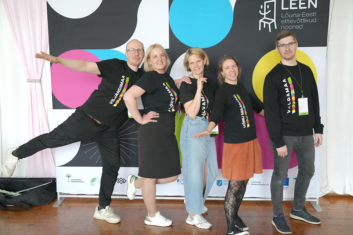 Lõuna-Eesti korraldajad (vasakult) Einar Ilves, Evelyn Sepp, Kristel Koddala, Kadi Kaur ja Rasmus Onkel ilusad maakonnad on kirjas nende riietusel. FOTO: MADE SULTSON Eile oli Voore põhikool koht, kuhu saabusid ettevõtlikud noored viiest Lõuna-Eesti maakonnast häkatonile nimega „Noorte mõttehäkk“. Häkaton on nimetus rühmatööle, mis kestab ühe või kaks päeva, et leida lahendusi või luua uusi…